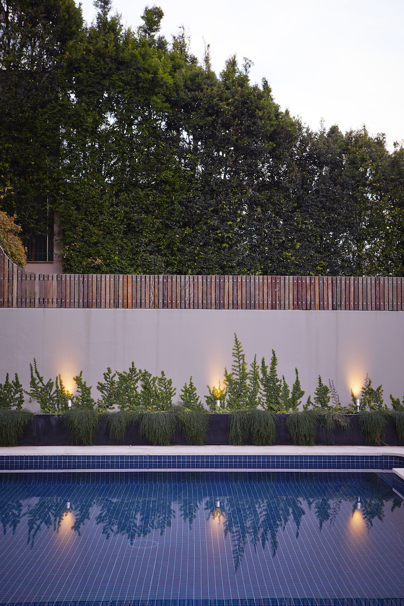 The existing pool and surrounds required a complete redesign focusing on space efficiencies. While creating a curved deck cantilevered over the pool was the first step to achieving this, the extension of the fully tiled pool surround elevated the pool use to another level.