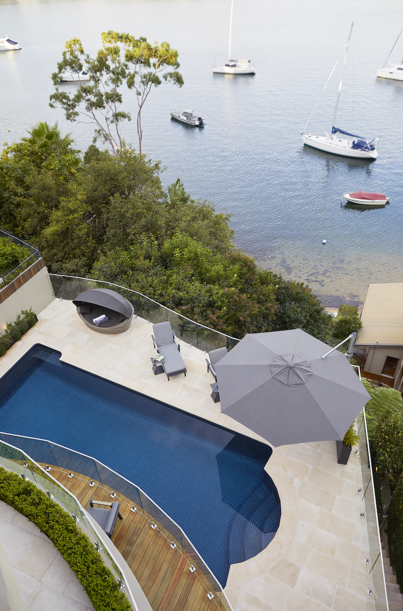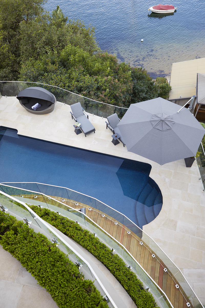 Custom curved hardwood daybed, Pool renovation and extended pool surrounds, La Roche Tiles, Floating bluestone viewing bar, Built-in gas + charcoal BBQs
