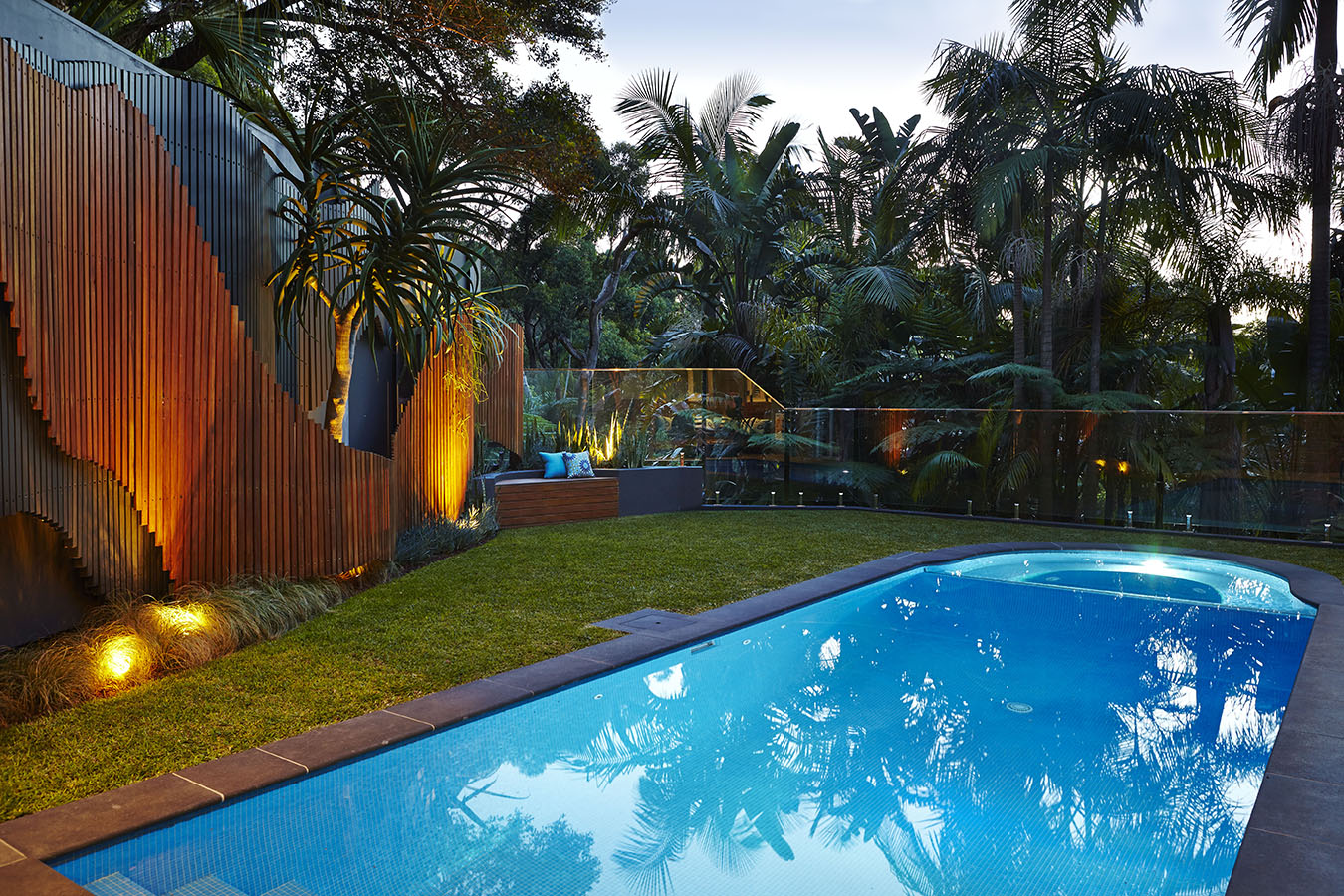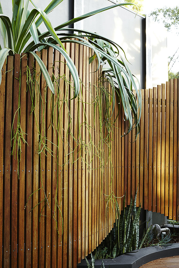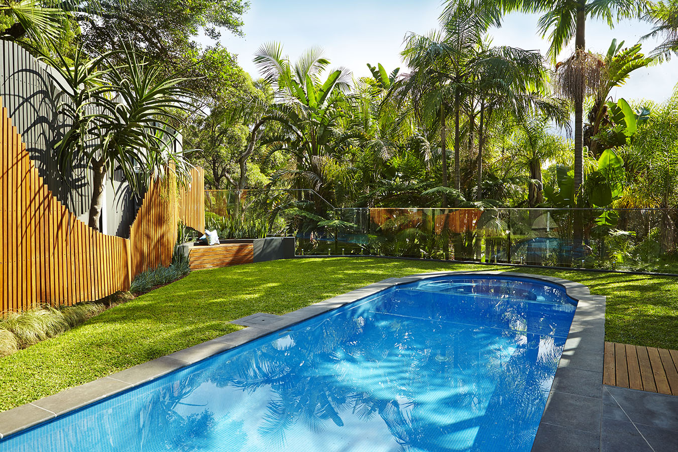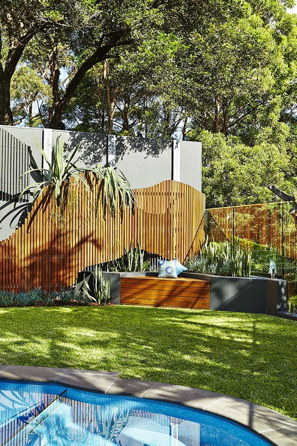 Curved timber screen, fully tiled renovated concrete pool, Aloe barberae -