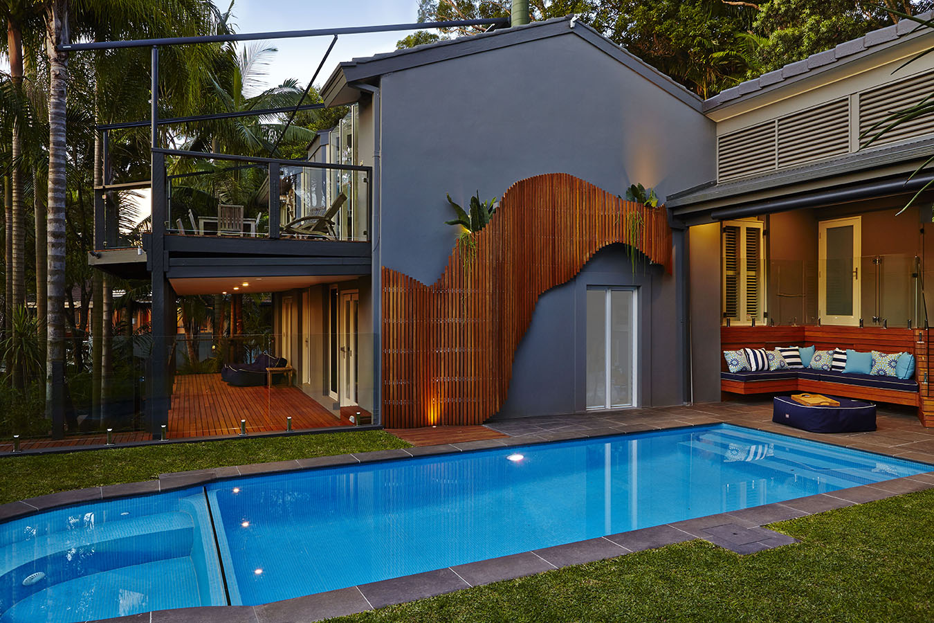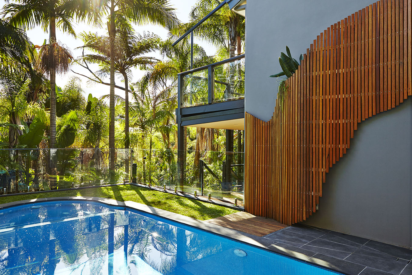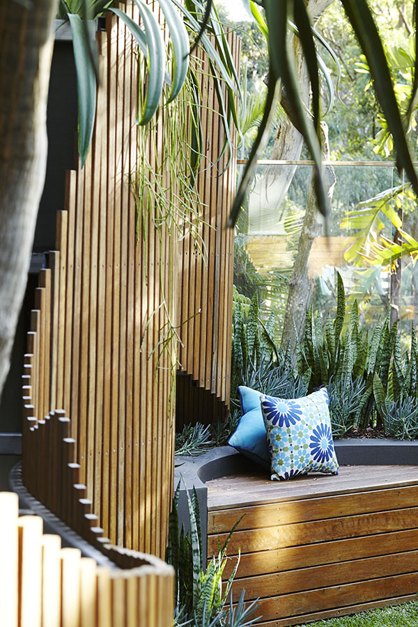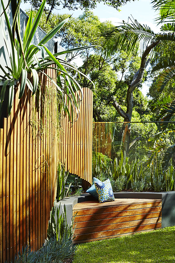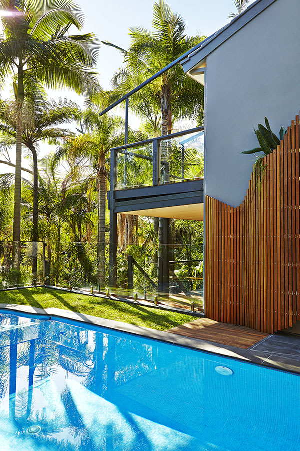 In this surprising oasis on Sydney’s lower north shore, reclining on the floating day bed is the ideal way to relax by the pool, set amongst abundant tropical greenery. The contemporary and eccentric design of hand-crafted timber panels provides visual interest and discrete privacy, while the cascading foliage and lush surrounds help you switch off from your busy life.