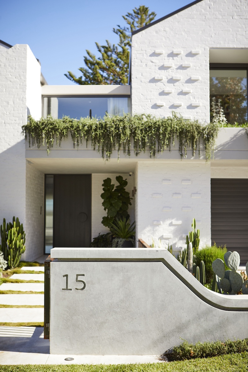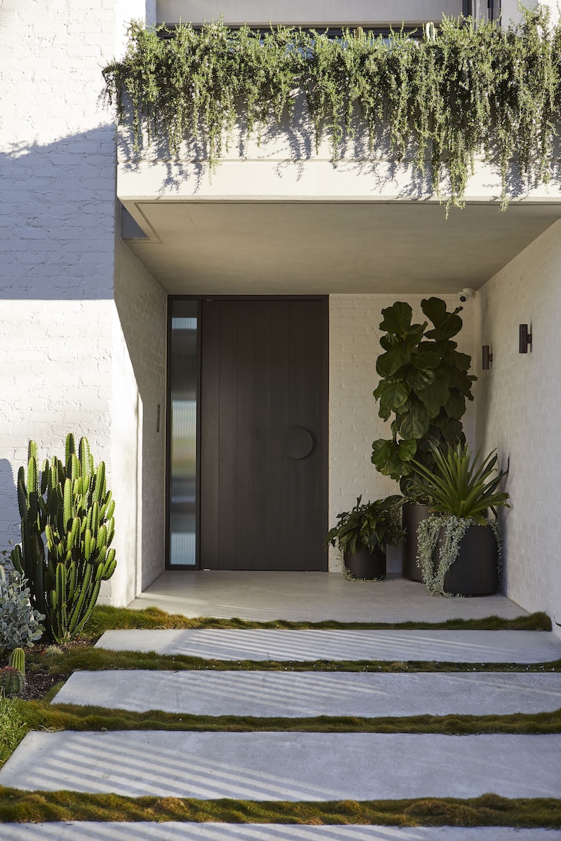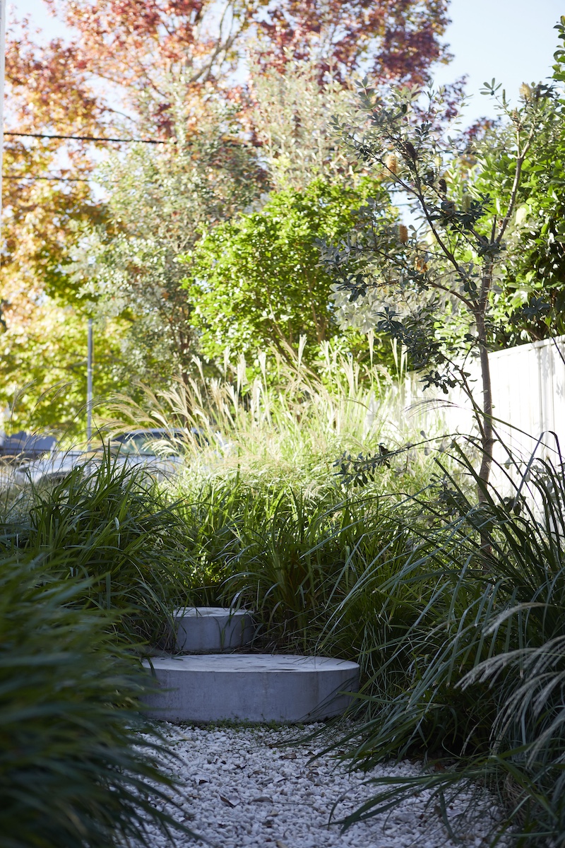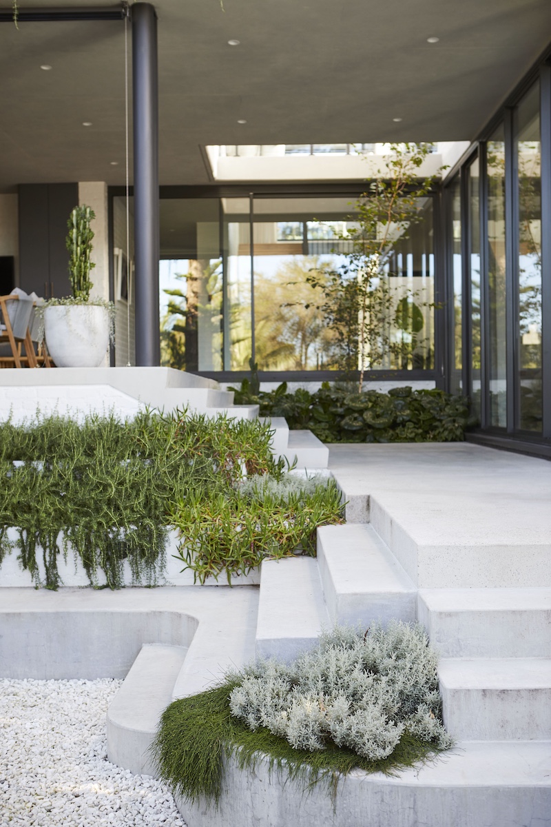 The welcoming touch of greenery makes this setting more appealing to both home owners and visitors. With the use of Prostrate Rosemary for spillover planting from first floor balconies and mounding Zoyzia tenufolia to soften the burnished concrete paths.