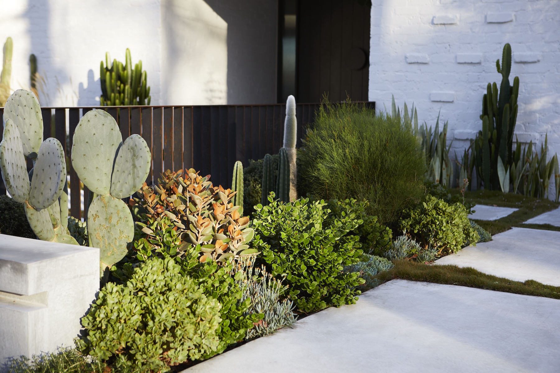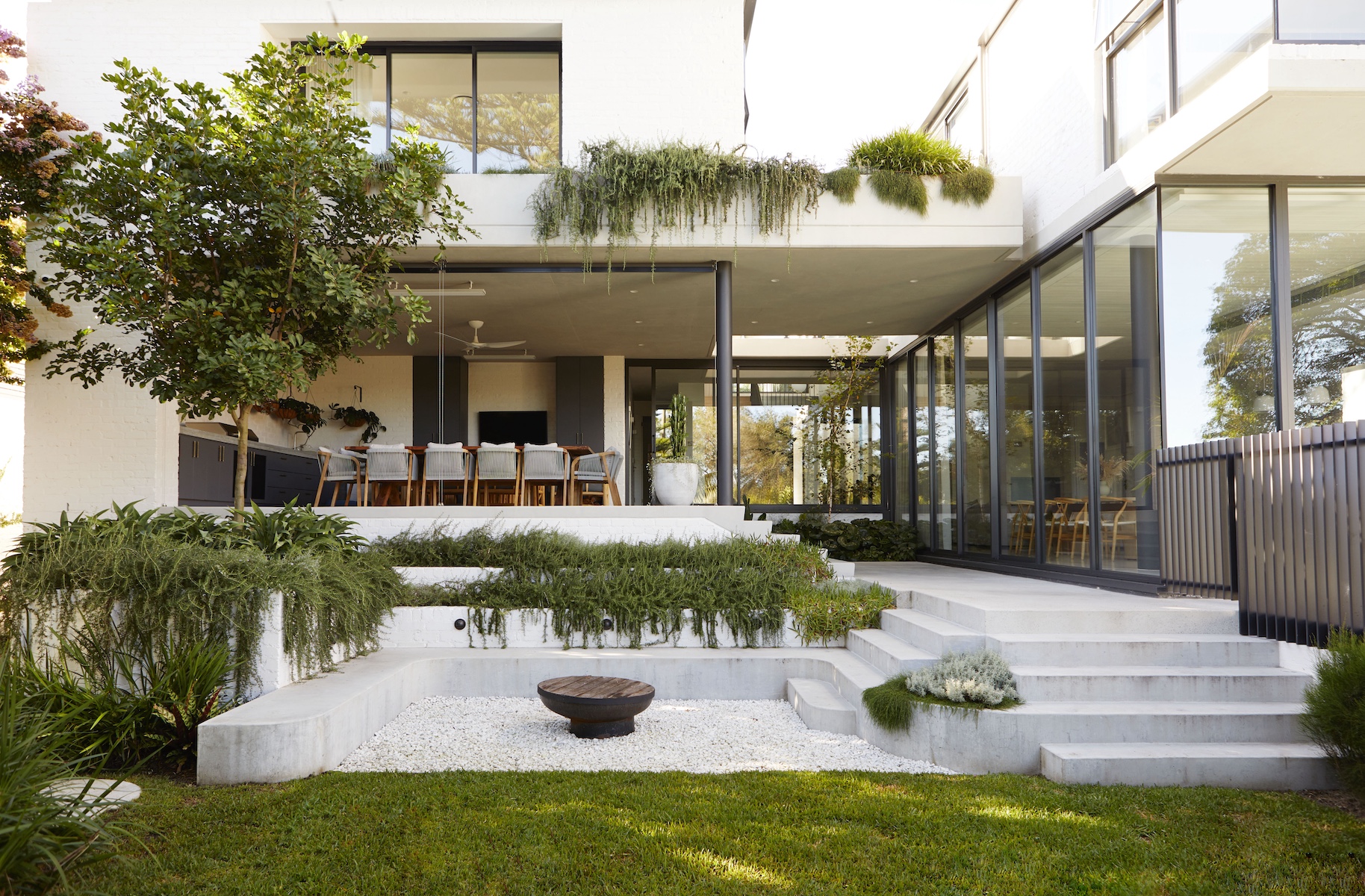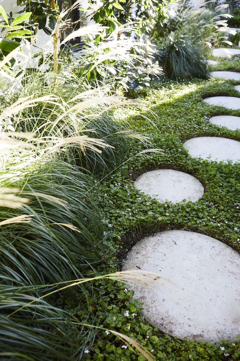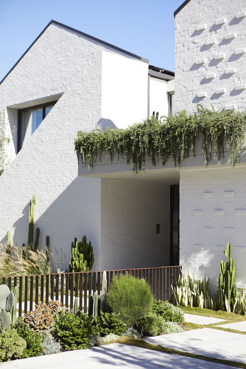 The welcoming touch of greenery makes this setting more appealing to both home owners and visitors. With the use of Prostrate Rosemary for spillover planting from first floor balconies and mounding Zoyzia tenufolia to soften the burnished concrete paths.